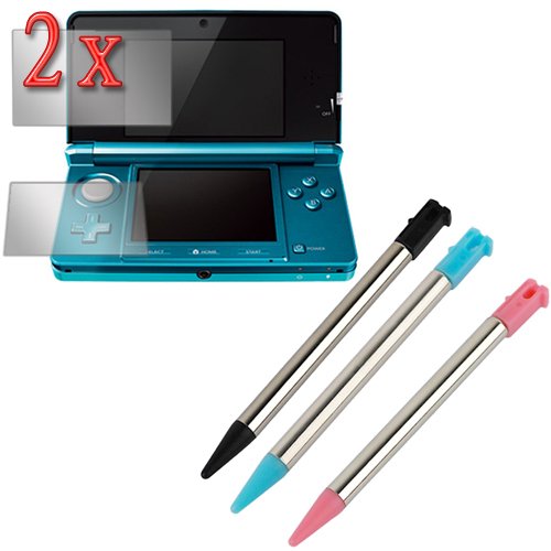 !9#GTMax 2x Clear LCD Screen Protector Film Guard + 3 Colors Retractable Metalic Stylus ( Black / Light Pink /Light Blue) for Nintendo 3DS